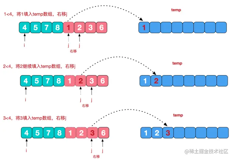 上图中的最后一次合并,要将[4,5,7,8]和[1,2,3,6]两个已经有序的子序列,合并为最终序列[1,2,3,4,5,6,7,8],下图是合并的流程(最后一次合并流程,前面n次合并流程也是一样的)