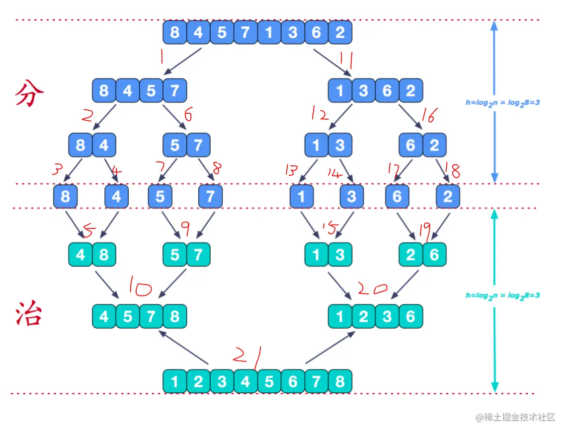 归并排序本质上其实不难,只是在递归拆分时,接触递归比较少的人很难理解他的执行过程,一旦理解了递归的执行流程,归并算法也就理解了。归并算法利用了分治思想,先分后治。下图表示了整个分治过程以及递归执行顺序: