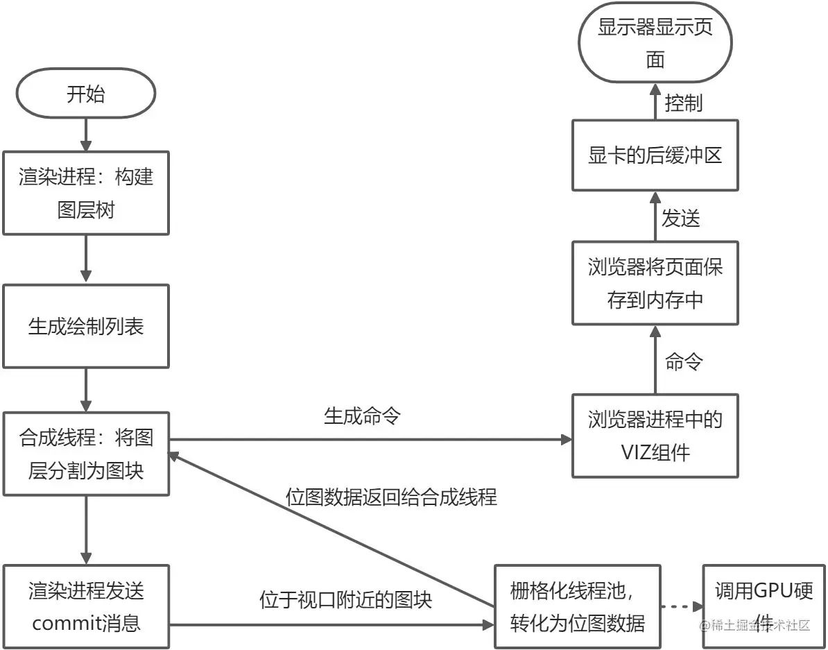 当合成线程接收到栅格化线程池发送过来的位图数据后会生成一个命令,随后将这个命令发送给浏览器进程,浏览器进程中的viz****组件接收到这个命令之后,会根据这个命令将生成好的栅格化后的****内容保存到内存中,也就是页面,然后将内存中保存的页面发送给显卡的后缓冲区,由显卡通过显示器来显示出来。