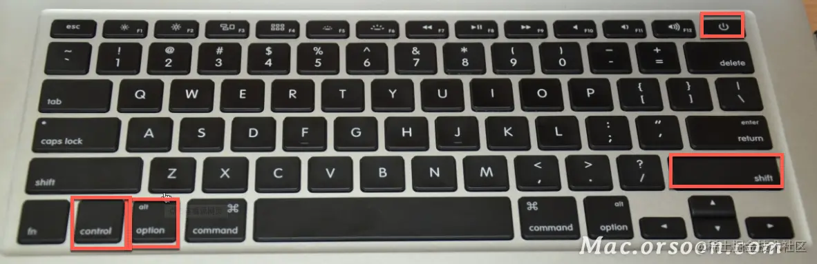 3.按住全部三个按键 7 秒钟,然后在不松开按键的情况下按住电源按钮。如果 Mac 处于开机状态,它将在您按住这些按键时关机。