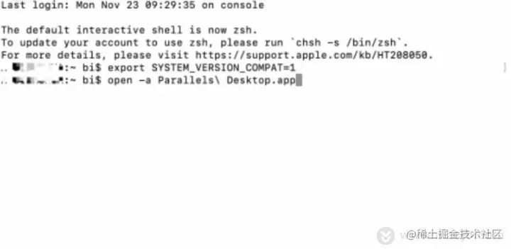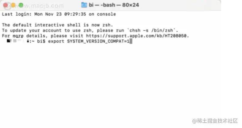 3.打开“终端”后,在终端命令行中,输入“export SYSTEM_VERSION_COMPAT=1”,输入完成后,回车,如下图所示。