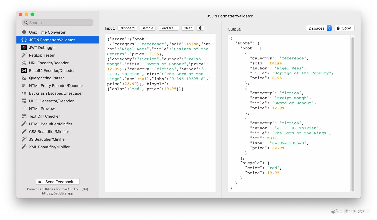 DevUtils-app 是一个 macOS 开发工具集,包括 JSON 格式校验、JWT 调试器、UUID 生成器、正则测试器等等10 多款开发小工具。