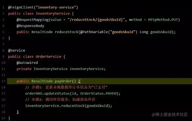 既然如此,那怎么办呢?别急,Feign 早已为我们提供好了优雅的解决方案。来看看如果用 Feign 的话,你的订单服务调用库存服务的代码会变成啥样?