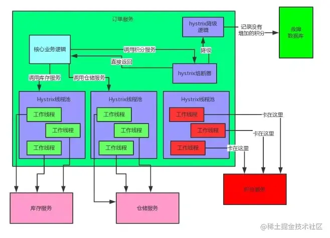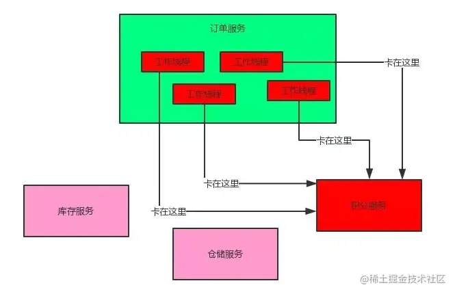 比如积分服务挂了,会导致订单服务的线程全部卡在请求积分服务这里,没有一个线程可以工作,瞬间导致订单服务也挂了,别人请求订单服务全部会卡住,无法响应。