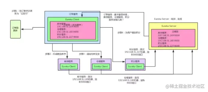 如上图所示,库存服务、仓储服务、积分服务中都有一个 Eureka Client 组件,这个组件专门负责将这个服务的信息注册到 Eureka Server 中。
