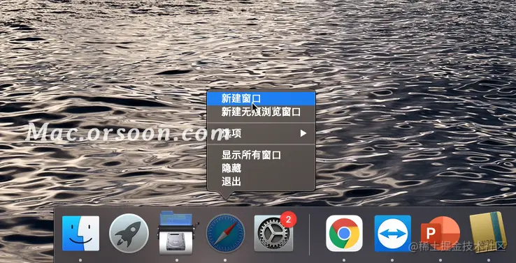 1、在dock栏中点击mac系统自带的浏览器safari,也可以在safari这个浏览器图标上点击鼠标右键-->【新建窗口】