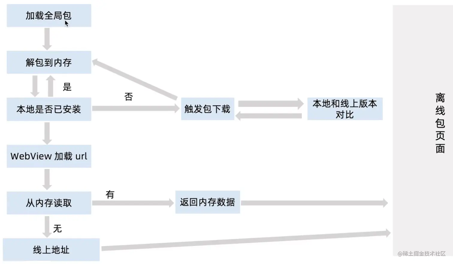 首先会加载一个全局的包就是一些基础的文件,加载之后会把包释放放在内存里,接着会做一个检测,查看本地是否安装,如果已经安装就释放到内存,如果没有安装就触发离线包的下载,就是我们做好的包放在服务器中,然后从服务器获取过来,在下载之前会进行一个本地和线上版本的对比,版本不一致的话就会下载最新的包,如果一致就取本地的就可以了。