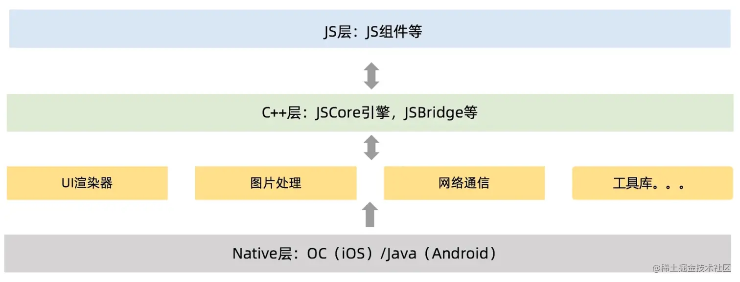 一共分成四层实现,最下面是native的原生层也就是OC和Java,在这之上是UI渲染器,图片处理,网络通信,和一些工具库,再向上是C++:JSCore,Bridge也就是js的运行环境和js和native的桥接。最上面才是js层也就是js的一些组件。