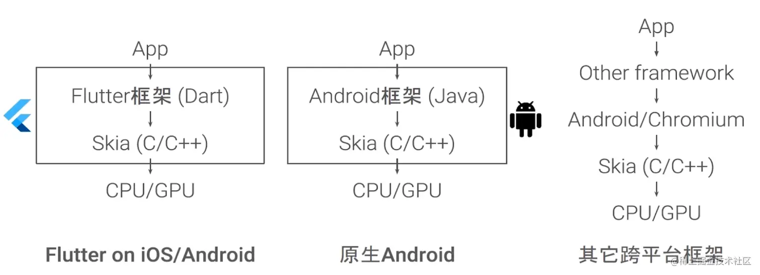 底层使用Skia图形引擎,图形性能媲美原生应用,界面更像一个全屏应用程序或2D游戏,速度比较快,使用本机ARM二进制文件,做到提前编译,不需要JVM,也就是java虚拟机。