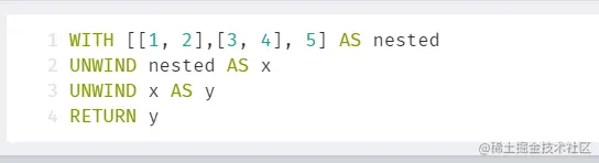unwind是cypher提供的一种列表遍历工具,unwind结合case等语法可以写出许多复杂的查询,尤其是对于路径查询的处理。官方文档对于UNWIND的说明:With UNWIND, you can transform any list back into individual rows. 注意两点,list和individual rows,说明输入只要是列表就行,输出是每一个元素。用法如下: