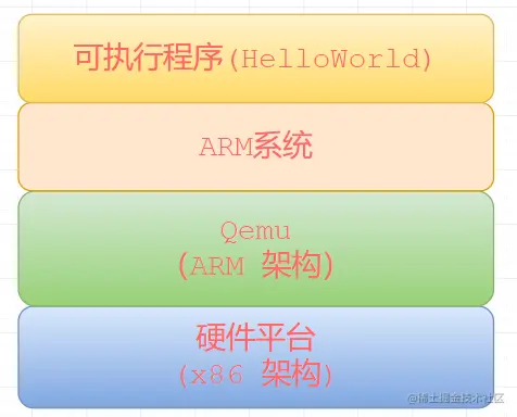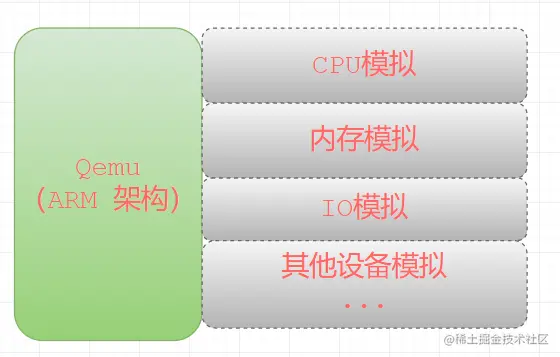 Qemu是一个开源的托管虚拟机,通过纯软件来实现虚拟化模拟器,几乎可以模拟任何硬件设备。比如:Qemu可以模拟出一个ARM系统中的:CPU、内存、IO设备等,然后在这个模拟层之上,可以跑一台ARM虚拟机,这个ARM虚拟机认为自己在和硬件进行打交道,但实际上这些硬件都是Qemu模拟出来的。