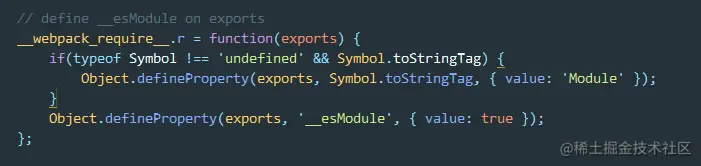这个方法是给模块的exports对象加上ES Harmony规范的标记,如果支持Symbol对象,则为exports对象的Symbol.toStringTag属性赋值Module,这样做的结果是exports对象在调用toString方法时会返回'Module'(笔者并没有查到这种写法的缘由);如果不支持Symbol对象,则将exports.__esModule赋值为true。