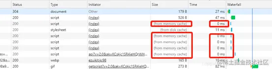 刷新页面,能看到有 304 状态码、from memory cache、0ms。