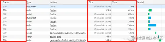 打开一个站点的控制台,选择Network,大致我们能看到这样子如图,我们重点观察Status、Size、Time这三列,主要能看到有 200 状态码(有一些是灰色的状态)、资源大小、from disk cache、时间等字样。