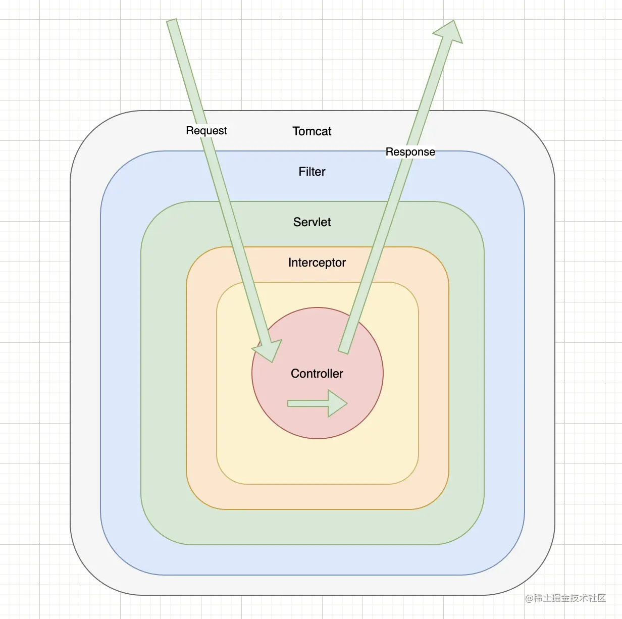 通过上图,我们可以进一步看到拦截器和过滤器的方法在整个请求过程中所处的位置。