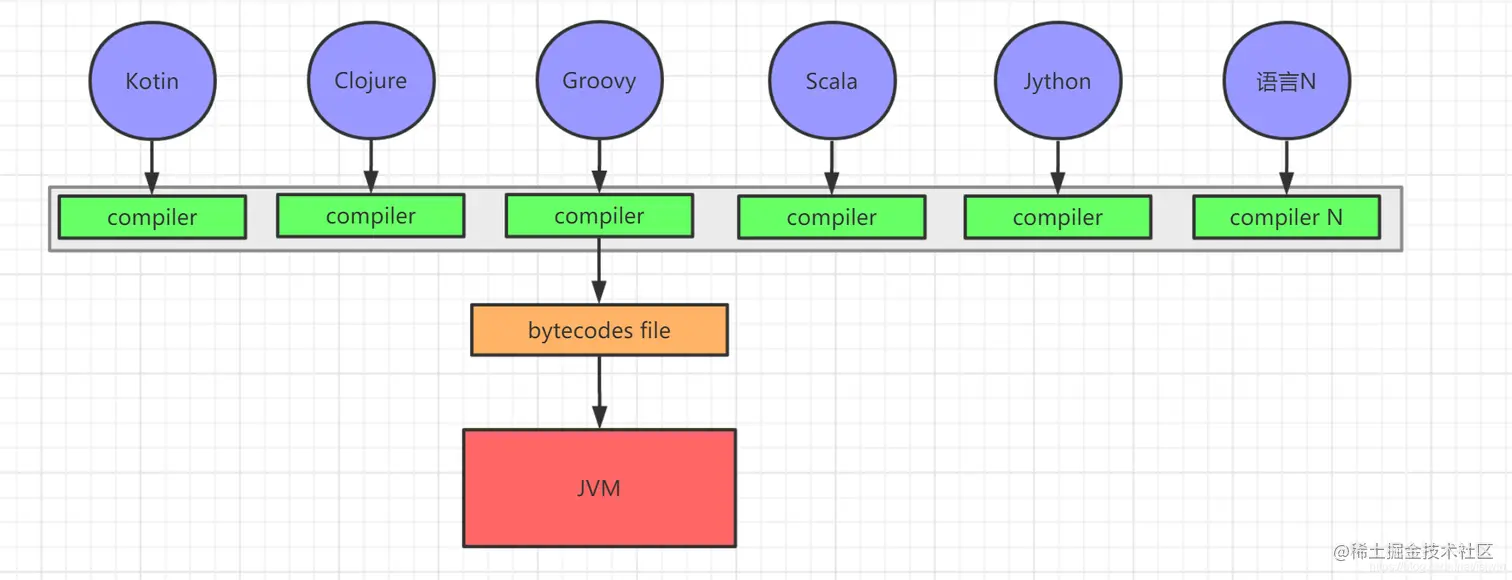 那么为什么要这样呢?因为 jvm 实在在普及了,又开发者原因为其适配、按其规范来开发编译器。