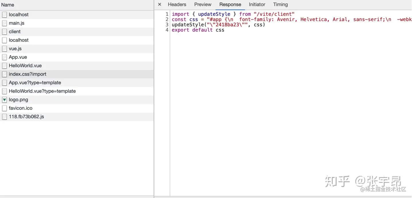 从 http://localhost:3000/src/index.css?import 请求的详细响应信息可以看出。实质是 Vite 是通过 updateStyle 这个方法来将 css 字符串挂载到具体的 dom 元素上