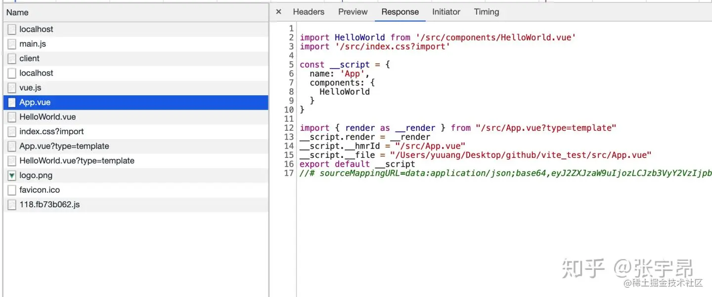 观察一下我们实际在浏览器中加载的文件内容。可以看到表面我们加载的是一个 .vue 组件。但是文件的实际内容还是传统的 .js 文件,并且 Content-Type 也是 application/javascript; charset=utf-8 所以浏览器才能够直接运行该文件。并且我们可以发现不同的文件类型后面跟的 query type 参数也不一样。有 ?type=template ?type=import。下面让我们来具体分析一下一个 Vue 组件是如何在浏览器中被渲染的吧