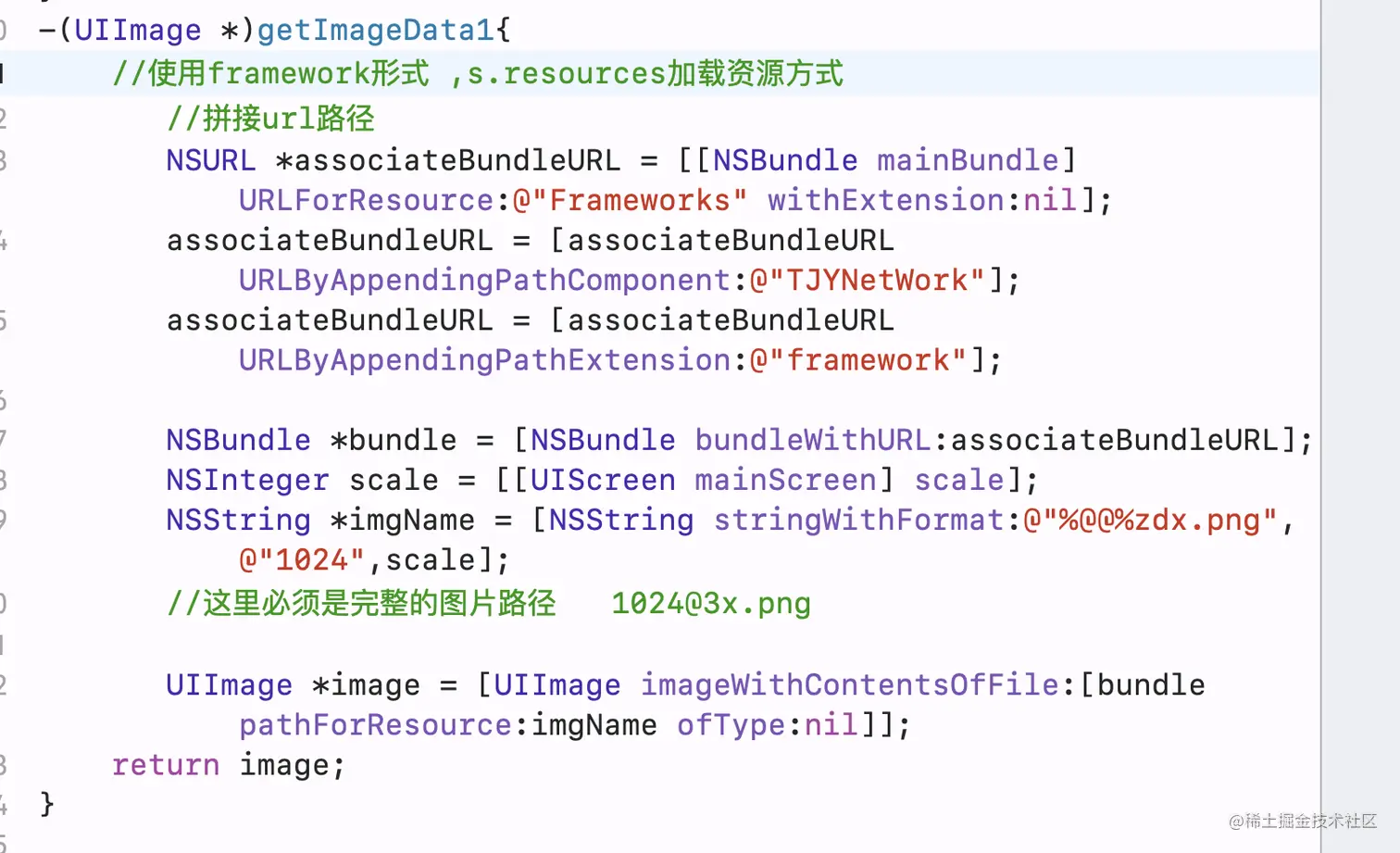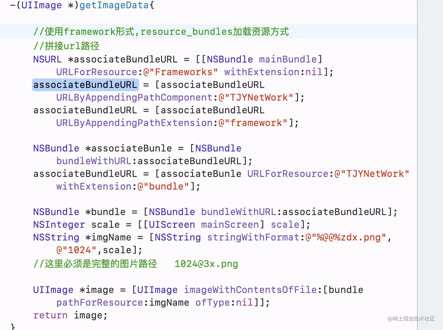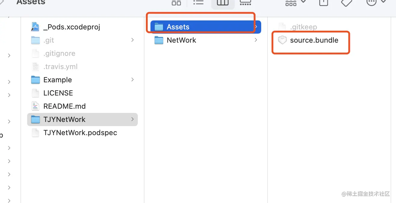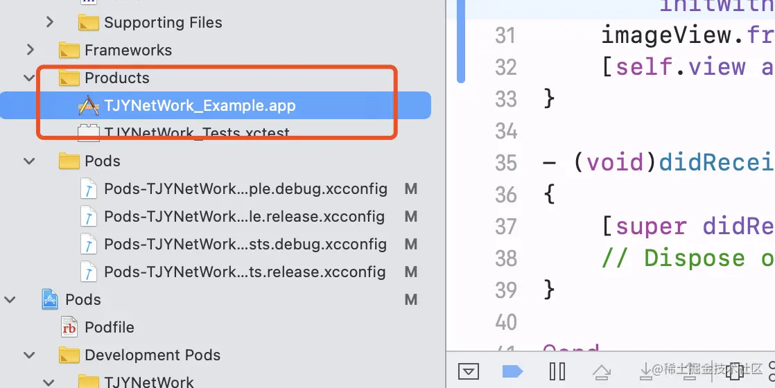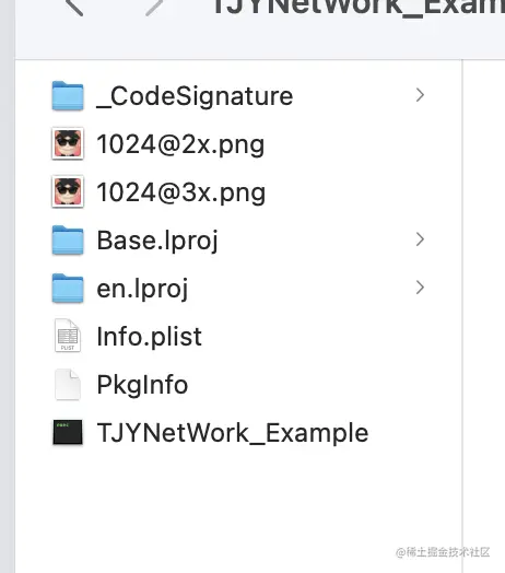 和上面不同的是上面的图片资源全部被自动打包到TJYNetWork.bundle中,这个里面的图片资源没有打包成bundle,而是直接显示在主包mainBundle中的,这种方式加载图片时可以直接采用imageNamed,同时也不需要写出完整的图片名字