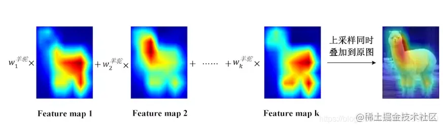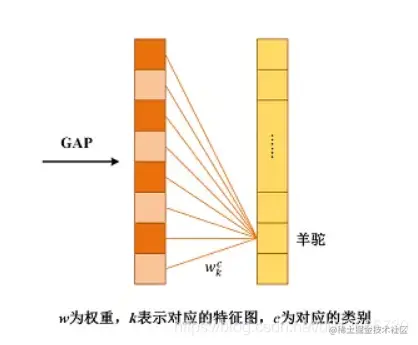 关键来了,CAM的可解释性的逻辑在于:假设我们最终预测的类别是羊驼,也就是说,模型给羊驼的打分最高。我们可以得到,左边向量计算出羊驼的权重值,也就是全连接层中的一部分权重值。这个权重值就是!!!就是最后一层特征图每一个通道的权重值。之前也提到了GAP的输出的一个向量代表着GAP输入的特征图的每一个通道嘛