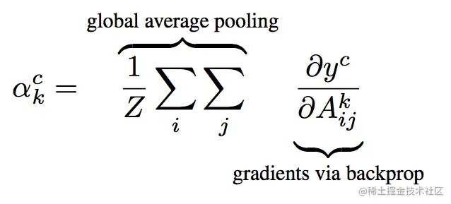 其中,z是一个特征图的像素量,就是width*height,可以看到,前面就是CAM的GAP的一个过程,后面的是模型给类别c的打分,就是特征图中ij这个位置的元素值。那么对这个求导,其实就是这个位置的梯度。