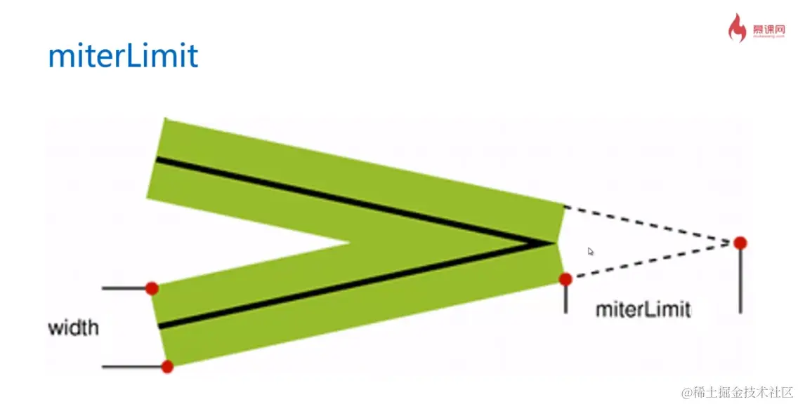 - context.miterLimit = 10 内角和外角的距离的最大值是10,超过最大值自动转化为bevel