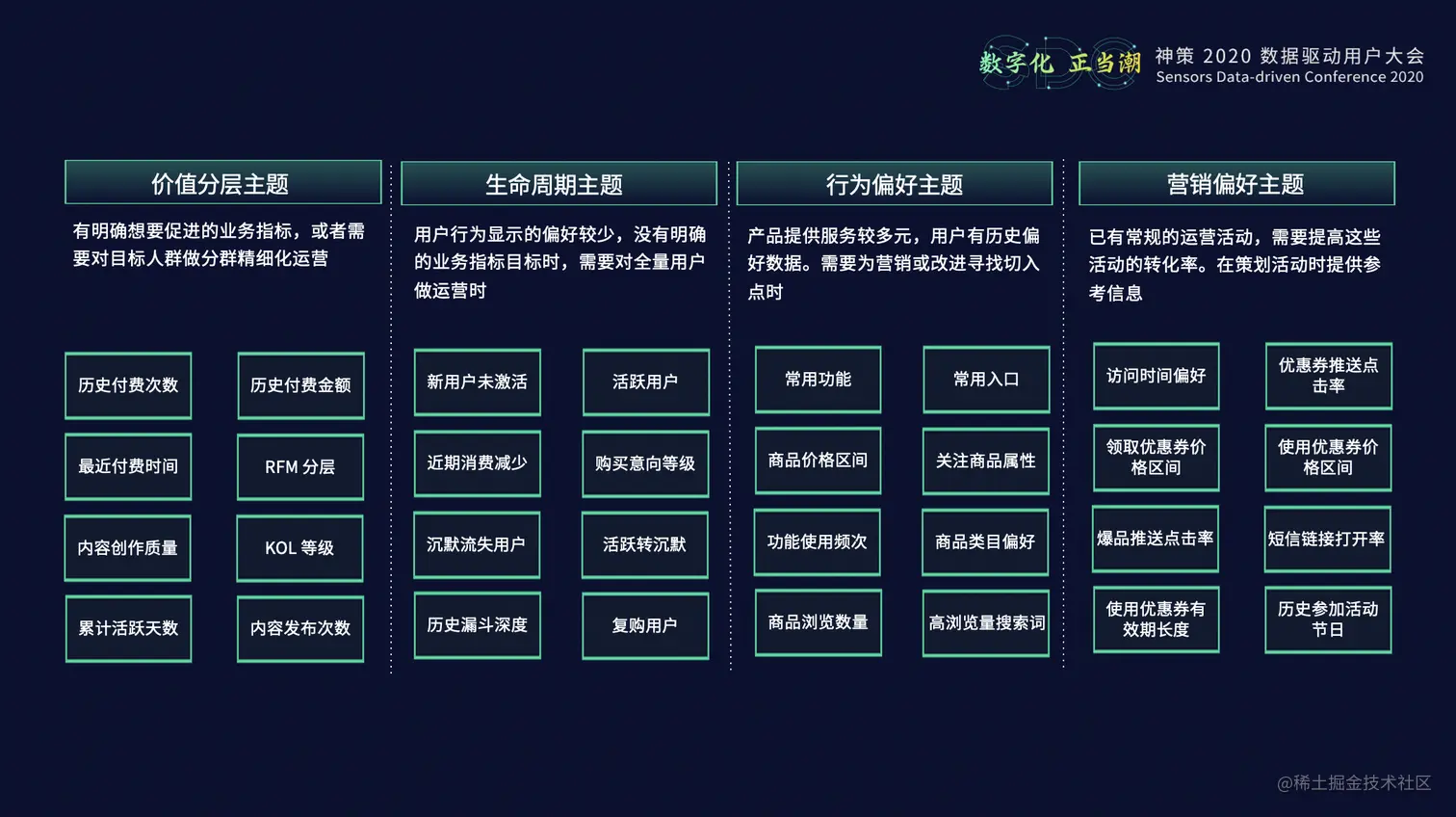 这类主题标签要从业务人员实际可以干预的维度出发,如:适合推送的时间段、优惠券的金额范围、适合的推送通道、文案的风格等等,业务人员可以根据这些标签来优化他们的工作。