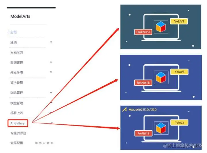 同时也许还能提升下运行速度,这里介绍三种算法,亲测都可以部署到HiLens Kit推理使用哦,就在最新的AI Gallery(原AI市场)中哦,这里除了有算法,还有模型、数据集等等,很丰富,大家可以自己探索一下,同时还可以分享自己的算法给其他开发者,开发者订阅即可创建训练使用,很方便,相比于GitHub,不仅提供了源代码,还提供了用于训练的硬件资源,强大的Tesla V100 32GB版本哦。