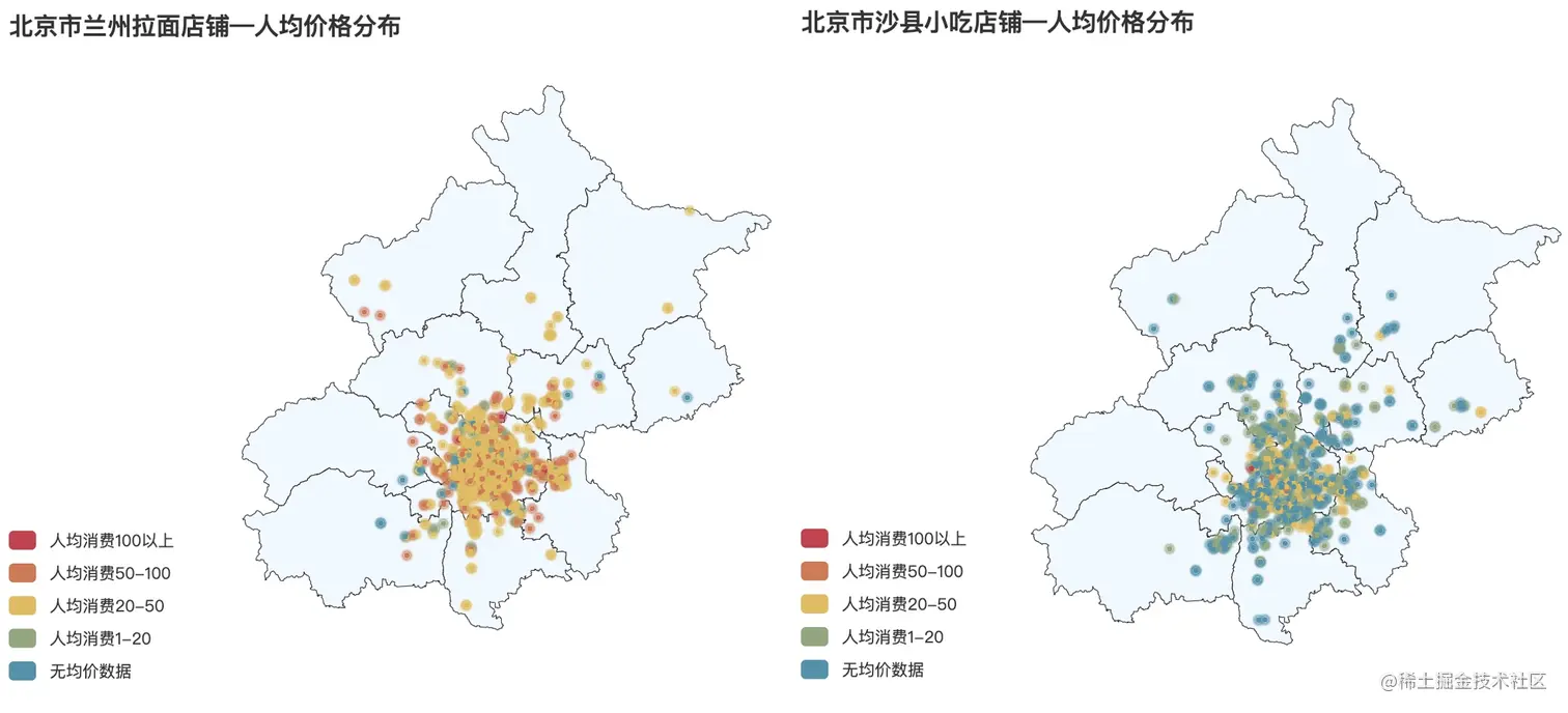 江湖上一直传言有肯德基的地方就有麦当劳,那么事实如此吗?我们爬取一线城市大众点评搜索肯德基和麦当劳关键字下的全部搜索页面,并将地址进行可视化如下图