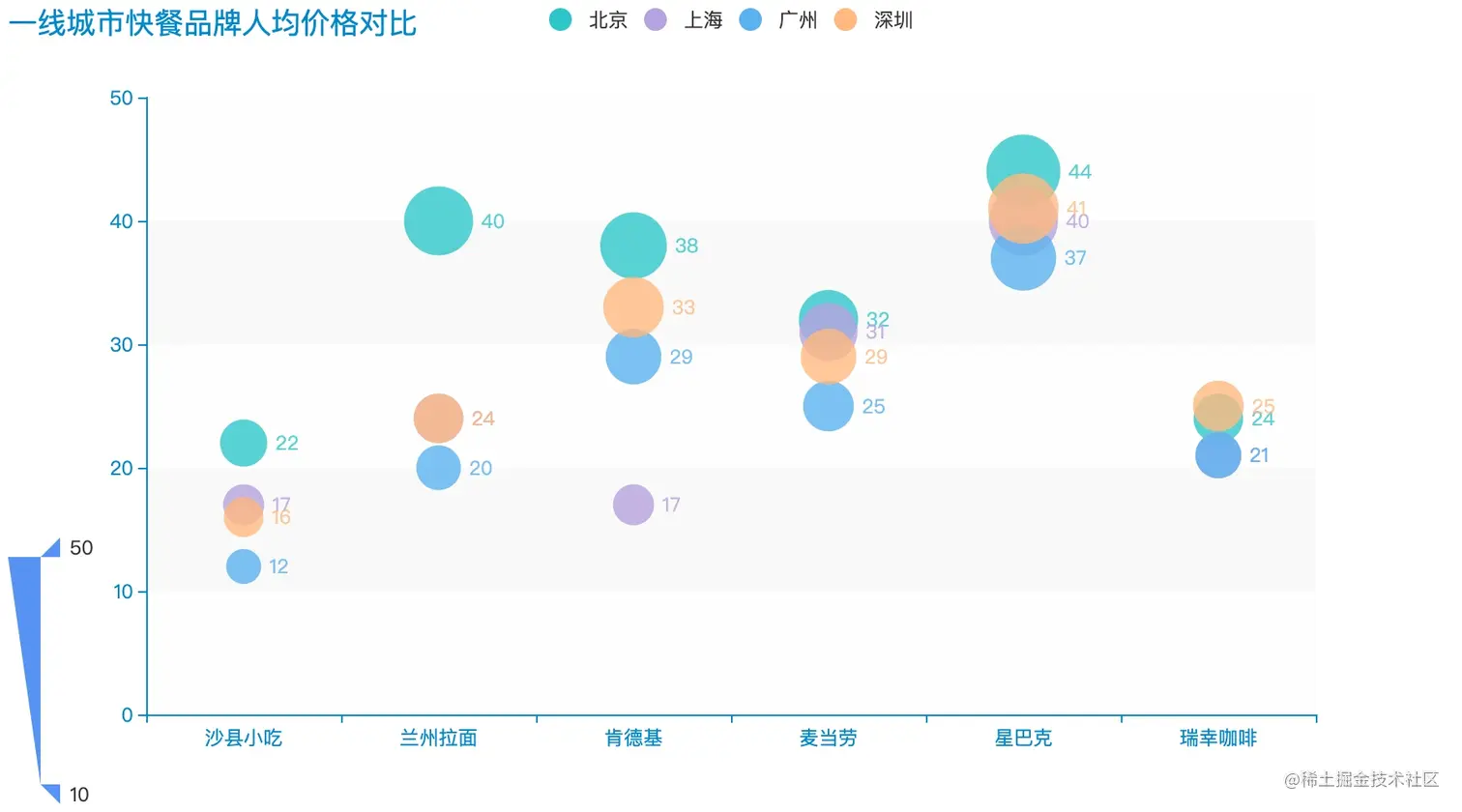 进一步,我们将全部一线城市的快餐品牌均价进行可视化。