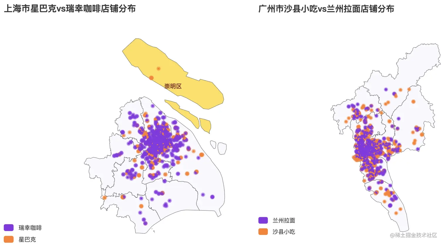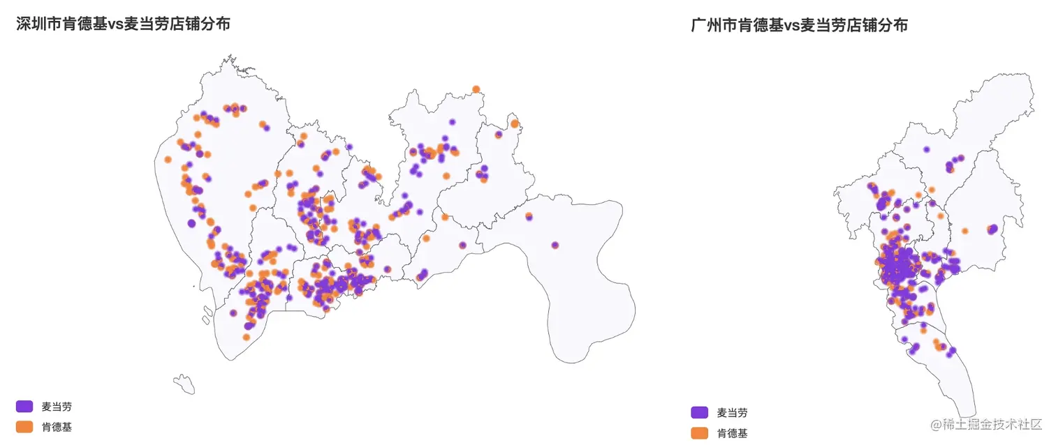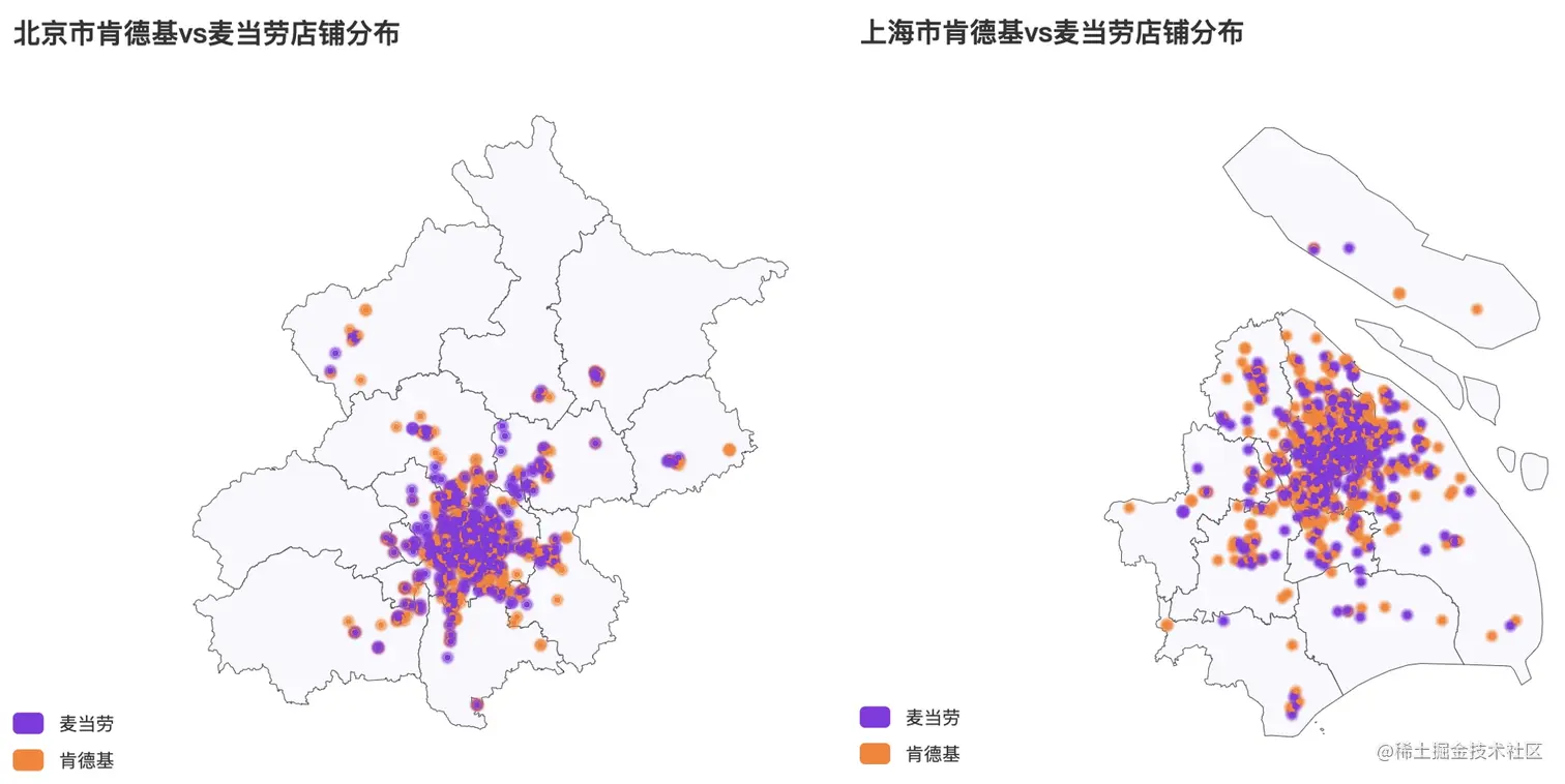 我们可以看到,不论在哪个城市,肯德基和麦当劳的店铺位置重叠度都非常高,就连在上海的崇明岛上,两家也有开在一起的店铺!