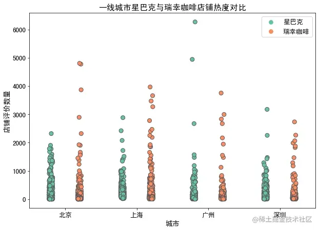从上一节的结果来看,星巴克的均价比瑞幸高出近一倍,那么是贵一点星巴克受欢迎还是优惠券多多的瑞幸咖啡更得人心,我们以店铺下面的评价数量作为店铺热度,对数据进行可视化