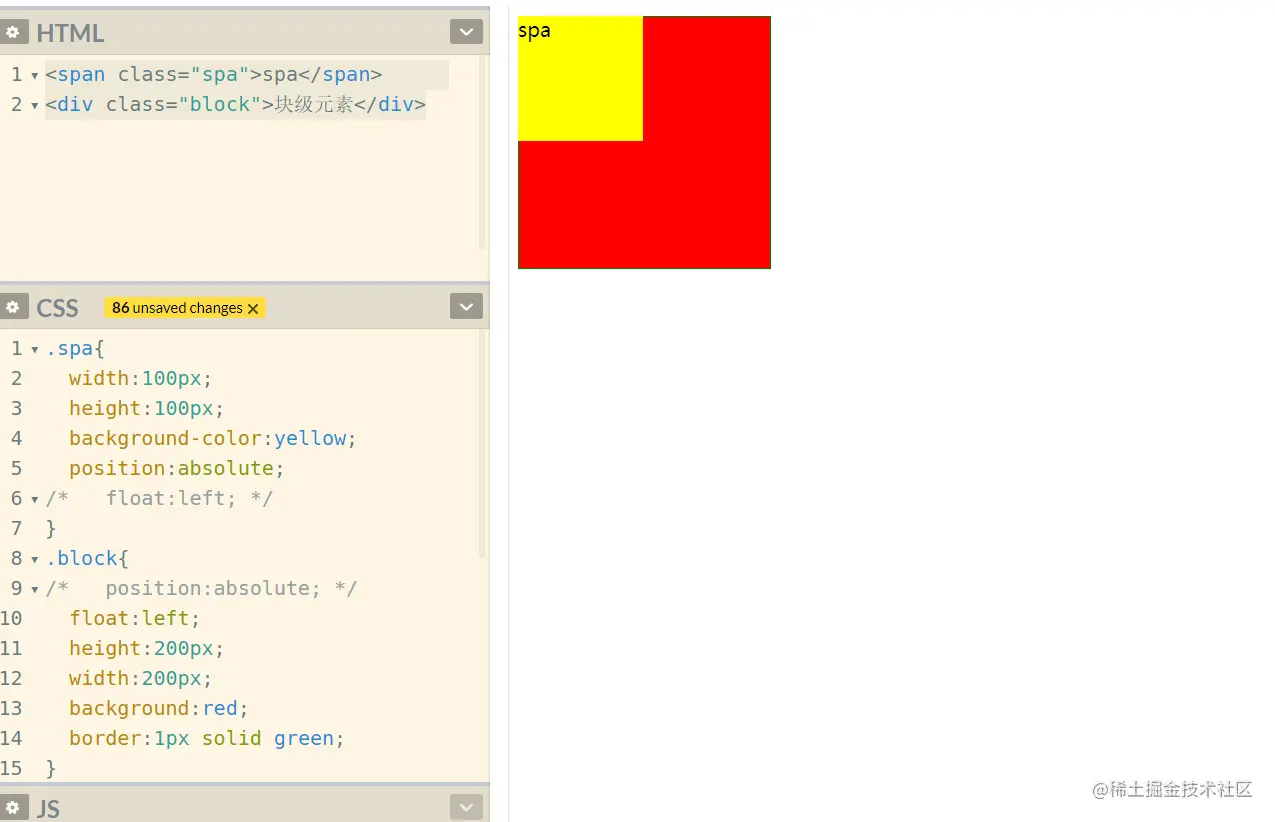 当为元素设置设置float属性或position:absolute属性(可以试验一下),块级元素和内联元素都会脱离文档流,同时display属性都变为inline-block。此时,元素可以设置大小,并能在同一行显示。