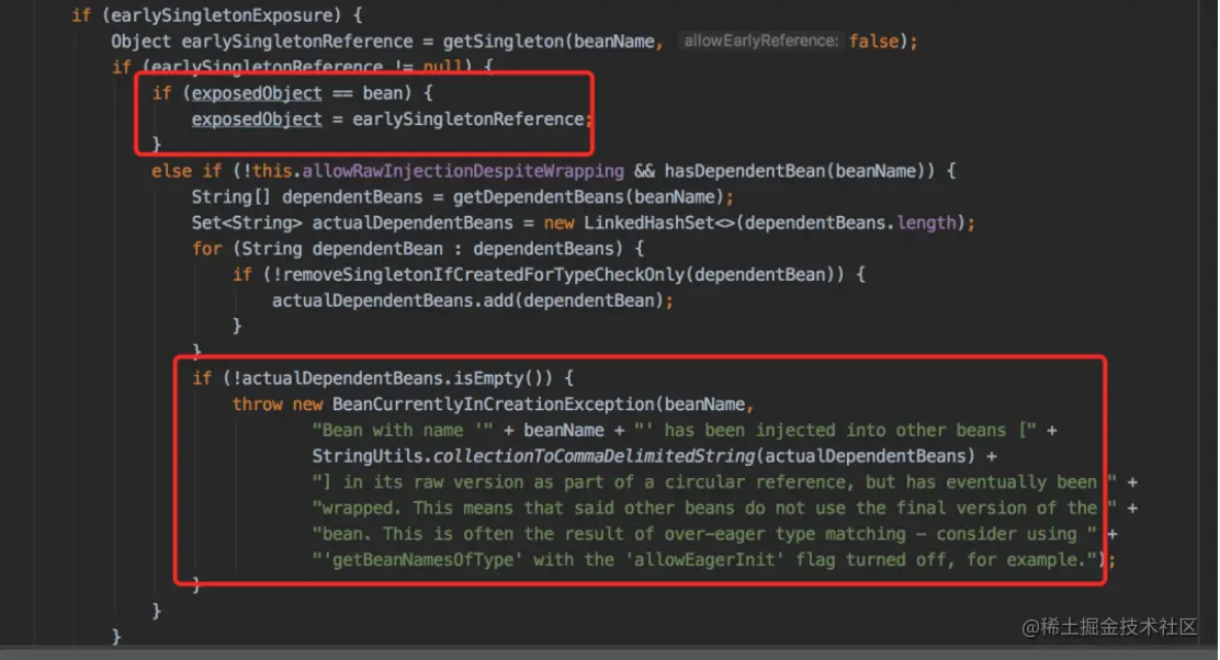 那位同事的问题正好是走到这段代码,发现第二级缓存 和 原始对象不相等,所以抛出了循环依赖的异常。