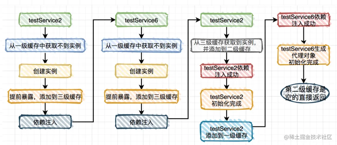 按照上图的流程可以把TestService1注入到TestService2,并且TestService1的实例是从第三级缓存中获取的。