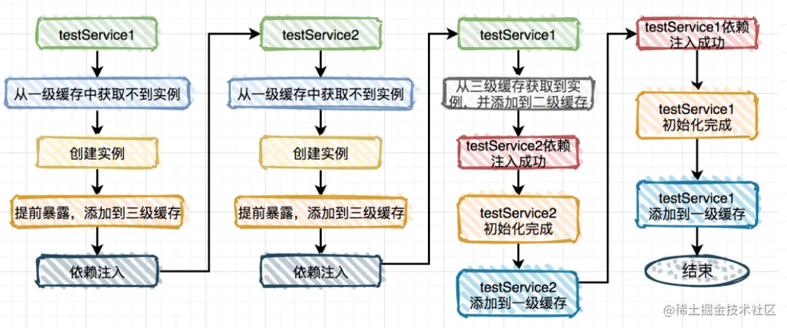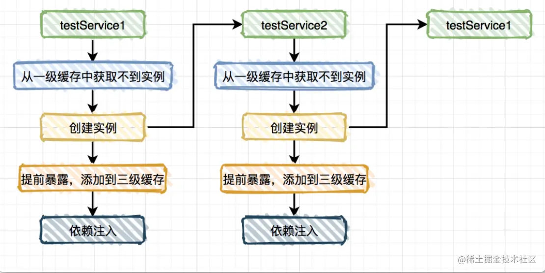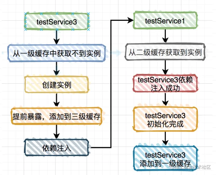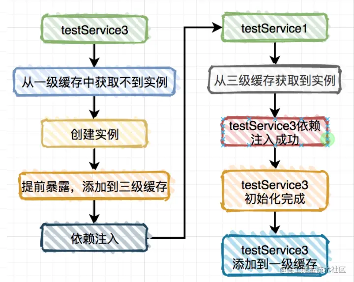 假设不用第二级缓存,TestService1注入到TestService3的流程如图: