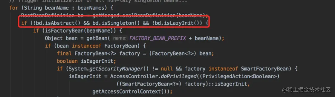 标红的地方明显能够看出:非抽象、单例 并且非懒加载的类才能被提前初始bean。