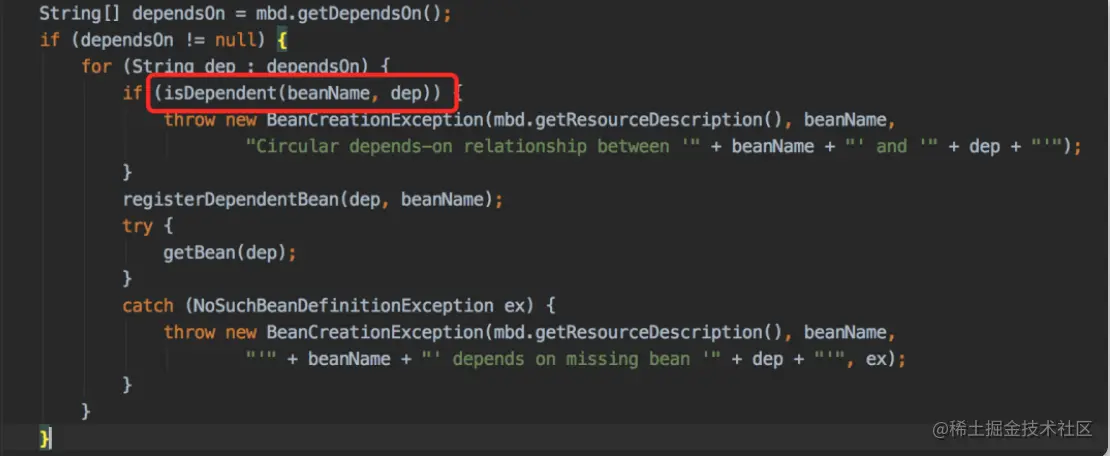 它会检查dependsOn的实例有没有循环依赖,如果有循环依赖则抛异常。
