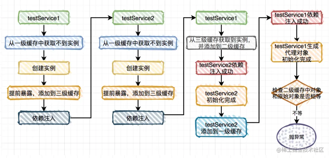 这种情况testService6中其实第二级缓存是空的,不需要跟原始对象判断,所以不会抛出循环依赖。