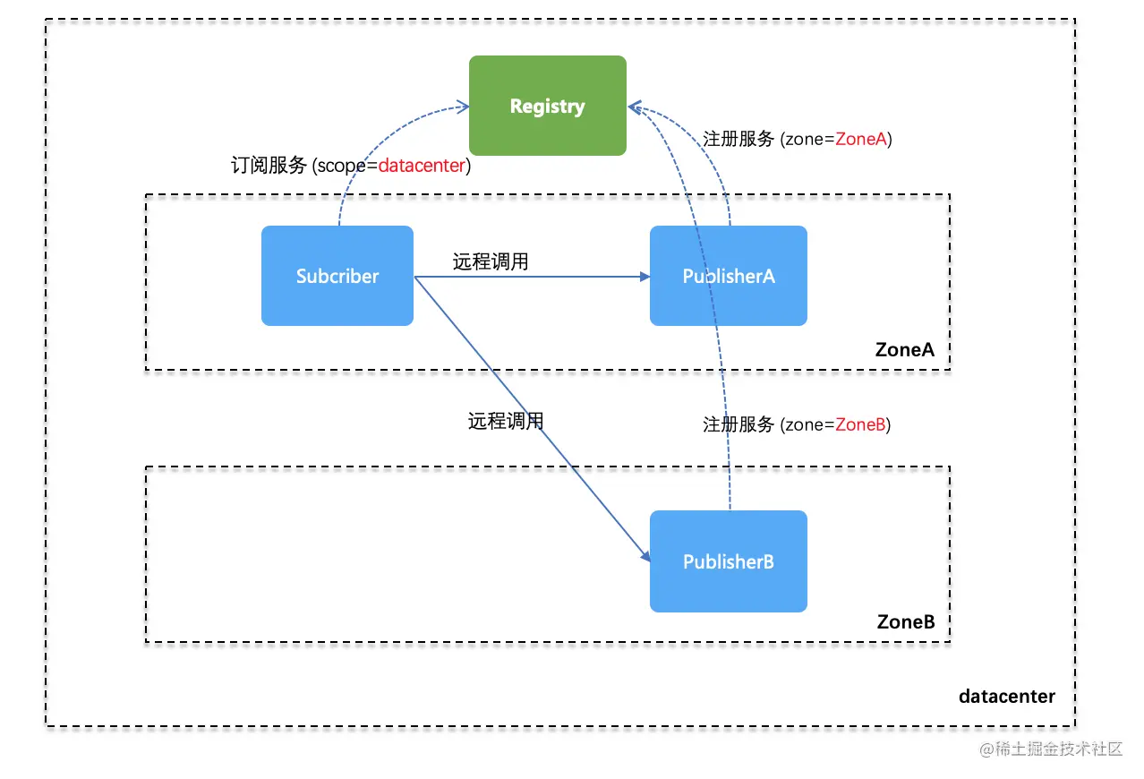 关于“zone”和“scope”的概念理解,这里再举个例子。如下图所示,物理机房内有 ZoneA 和 ZoneB 两个单元,PublisherA 处于 ZoneA 里,所以发布服务时指定了 zone=ZoneA,PublisherB 处于 ZoneB 里,所以发布服务时指定了 zone=ZoneB;此时 Subscriber 订阅时指定了 scope=datacenter 级别,因此它可以获取到 PublisherA 和 PublisherB (如果 Subscriber 订阅时指定了 scope=zone 级别,那么它只能获取到 PublisherA)。