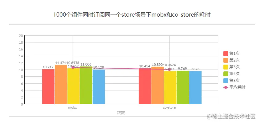 性能对比其实非常麻烦,因为很难找到一个标准去衡量,查找了不少资料,觉得Mobx 与 Redux 的性能对比这篇文章的对比场景还是可以借鉴的,下面就基于这个场景,直接对比一下在1000个组件同时订阅同一个store场景下mobx和co-store的耗时: