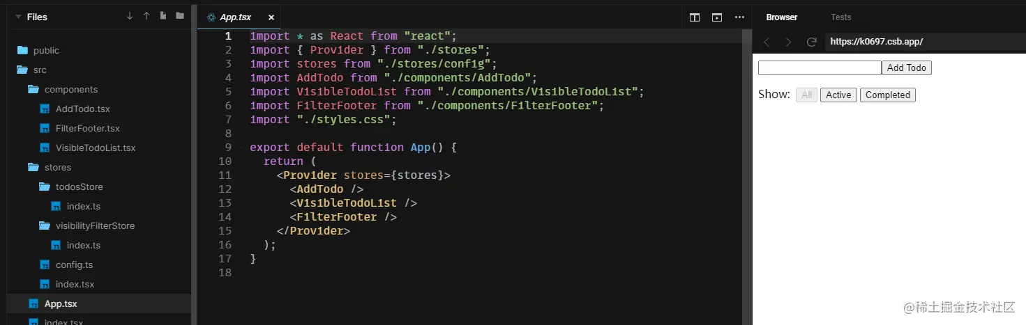 // 创建 const store = () => useLocalStore(() => { return { ...state, ...actions } }) // 接入React <Provider stores={stores}>...</Provider>