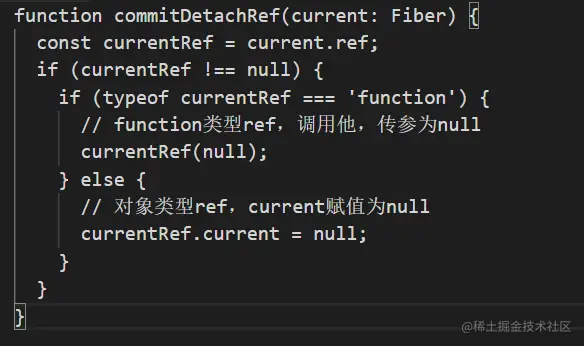 2. commitDetachRef 移除实例,在组件或元素被销毁前执行,在componentWillUnmount之前清理引用。 卸载时传入null,将当前的DOM元素赋值为null
