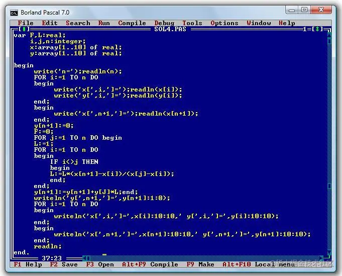 我是高中的时候学习编程的,那时候我们学的是Pascal。大家没听说过是很正常的,这是一门非常古老的语言。这门语言古老到什么程度呢?古老到它的IDE都是蓝屏的,看起来就像是死机了一样。大概长这样,当时我们在机房里写代码的时候,一片蓝光,跟进了鬼片现场似的。