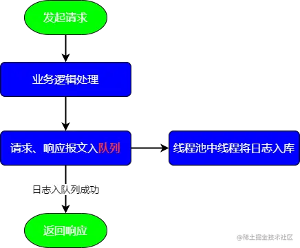 普通入库就是直接进行完业务逻辑处理并构建好响应后同时将日志进行入数据库,入库成功后再将响应返回;