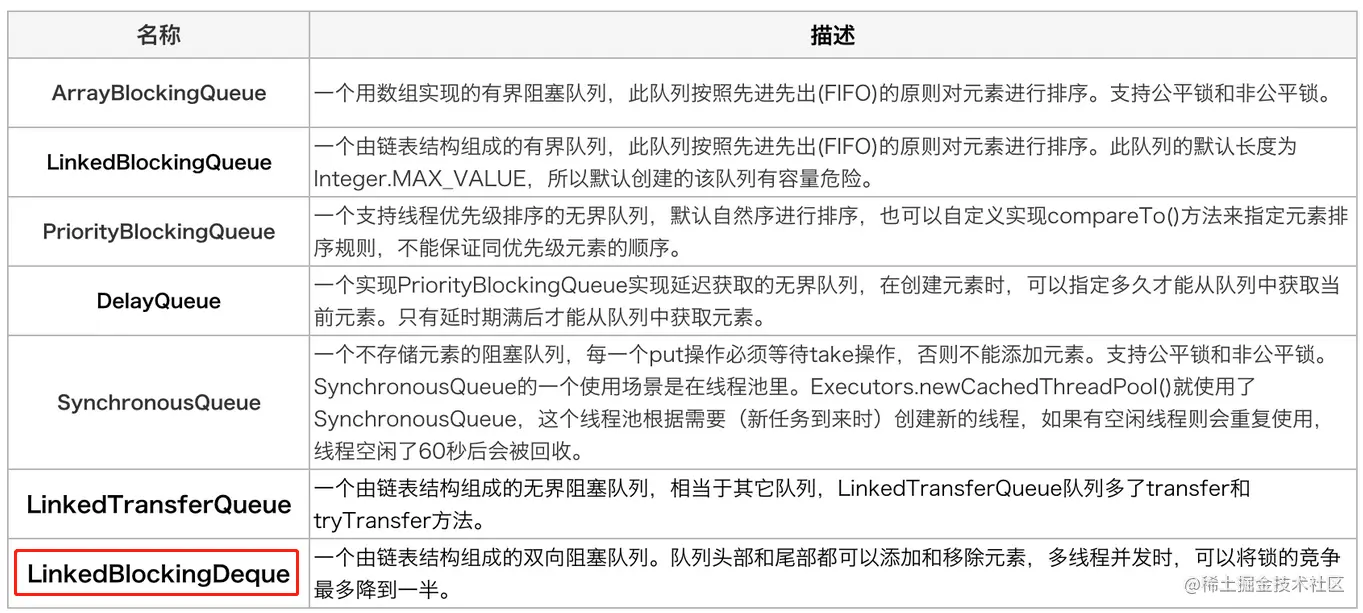 除了 LinkedBlockingDeque 阻塞队列外,还有一些其它经常会用到的阻塞队列,如下图: