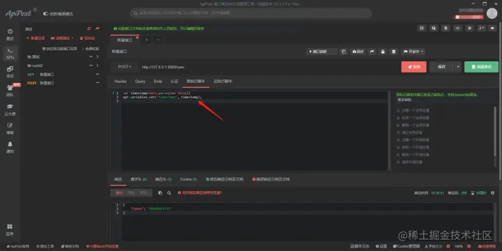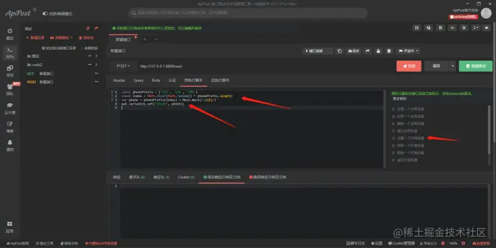 1)生产一个随机手机号,熟悉mock.js的可以自己编写一下,不会的可以直接百度,然后粘贴到与执行脚本中,在设置一个环境变量,变量值为数据生产的手机号: