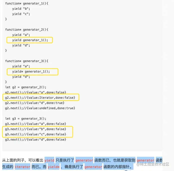 当它被调用时就会生成一个迭代器对象(Iterator Object),它有一个 .next()方法,每次调用返回一个对象{value:value,done:Boolean},value返回的是 yield 后的返回值,当 yield 结束,done 变为 true,通过不断调用并依次的迭代访问内部的值。