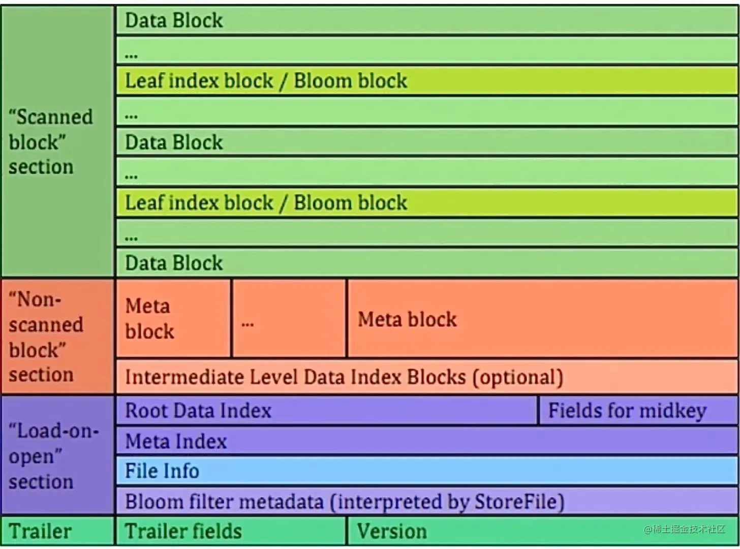 - Load - on - open section : HFile 文件的元数据信息,在 Region Server 启动的时候,会加载到内存中