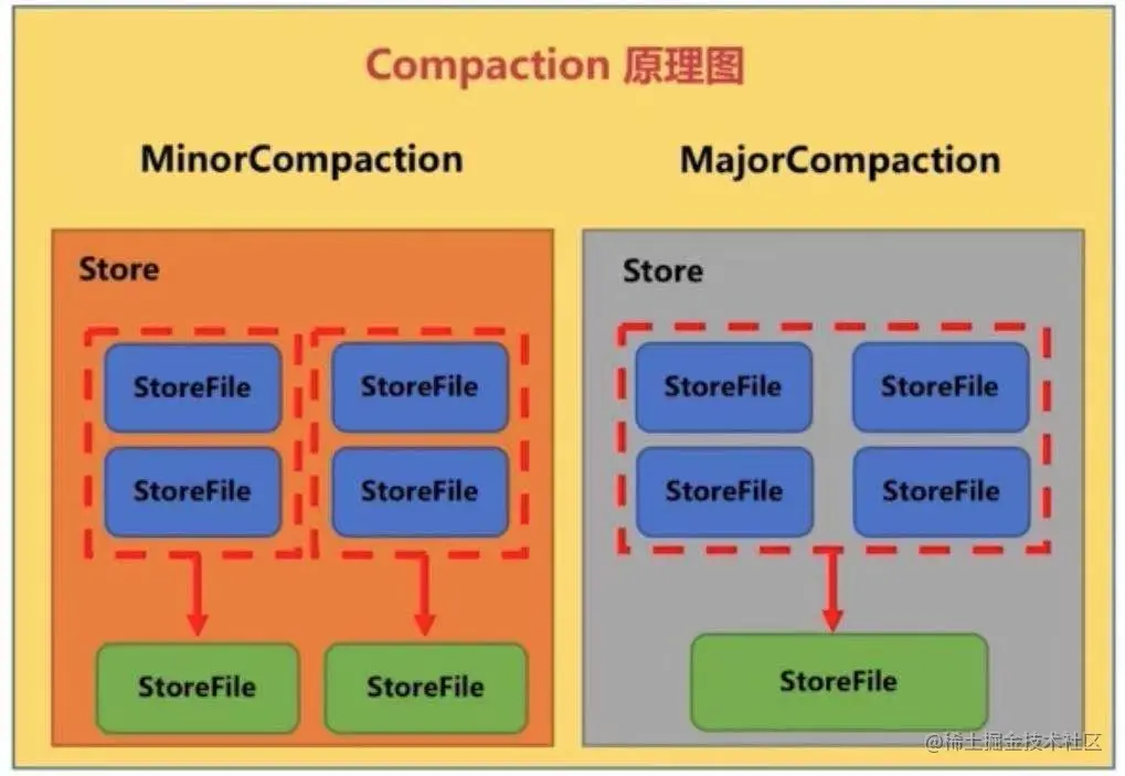 HBase Compaction 会在特定的时期,合并某个 RegionServer 的某个 Region 的某个 Store 中部分的 storeFile文件。也就是说 HBase Compaction 的合并操作不会垮两个 Store。